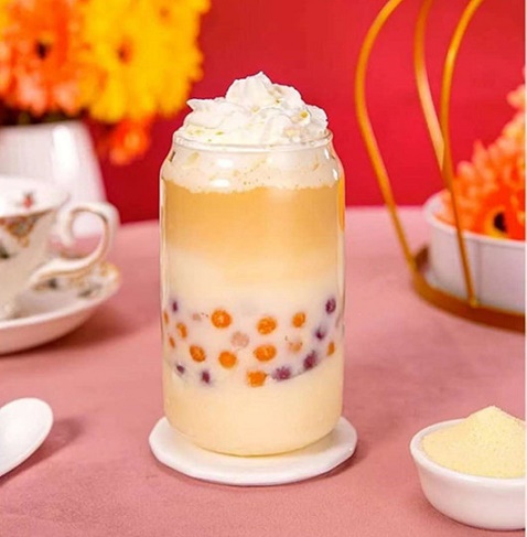 在大眾的飲品中被廣泛應(yīng)用的豆制品就是豆花布丁奶,這杯加了豆花布丁奶的飲品在顏值上毫不遜色,口感上也是獨(dú)具風(fēng)流,豆香與茶香、奶香交融,加上清爽不膩的紅茶,完美的平衡了甜度和口感,吸管插到底猛吸一口,嫩滑的豆花布丁伴著Q彈的芋圓,隨著濃郁的豆香奶茶流淌進(jìn)嘴里,口感和風(fēng)味多樣又有趣。